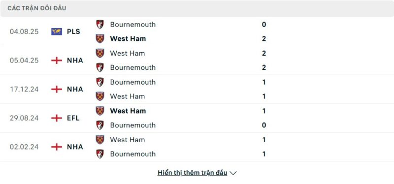 Thành tích đối đầu của Bournemouth vs West Ham United