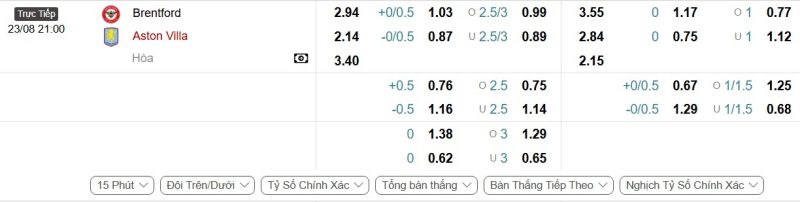 - Kèo tỷ số bóng đá hiệp 1: Brentford 2-0 Aston Villa