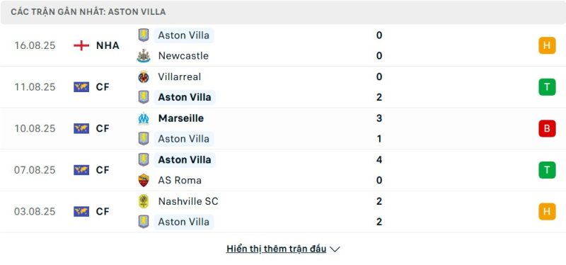 5 trận gần nhất của Aston Villa: D-W-L-W-D