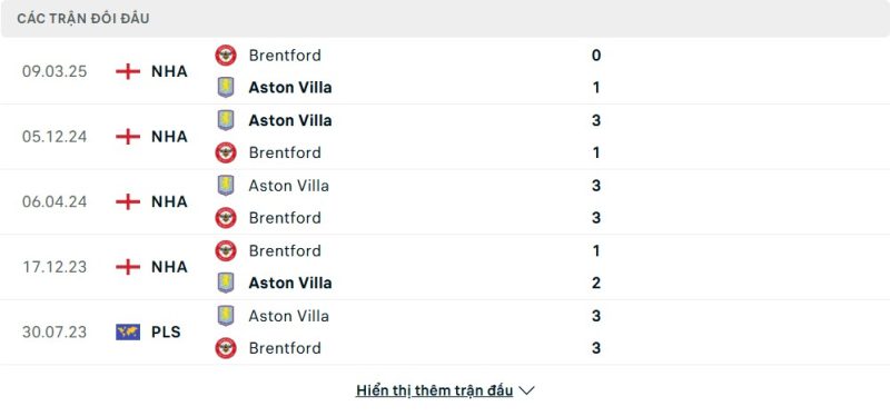 Thống kê phong độ gần đây Brentford vs Aston Villa
