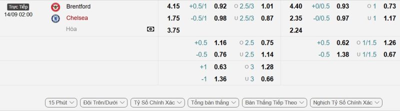 Bảng Tỷ lệ kèo bóng đá Brentford vs Chelsea