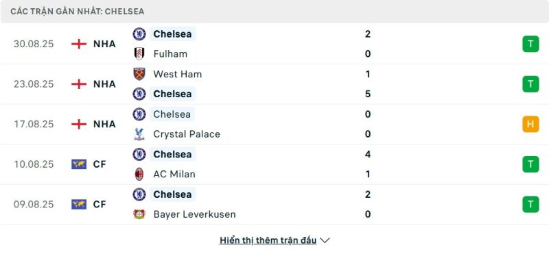 5 trận gần nhất của Chelsea: W-W-D-W-W