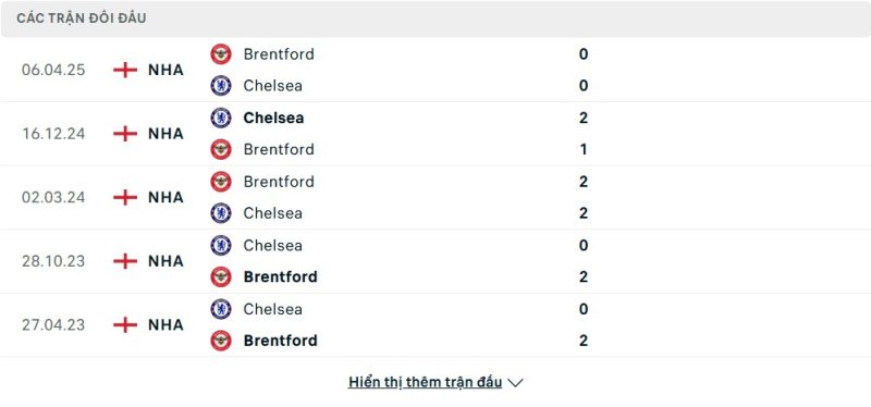 Thống kê phong độ gần đây Brentford vs Chelsea