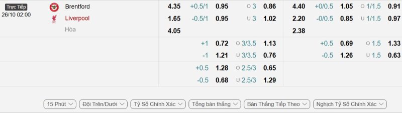 - Kèo tỷ số bóng đá hiệp 1: Brentford 1-1 Liverpool