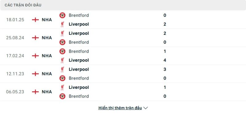 Thành tích đối đầu của Brentford vs Liverpool