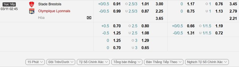 Bảng Tỷ lệ kèo bóng đá Brest vs Lyon