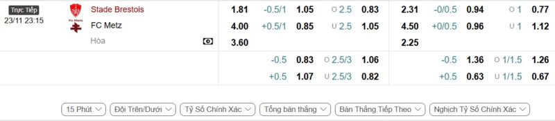 Bảng Tỷ lệ kèo bóng đá Brest vs Metz