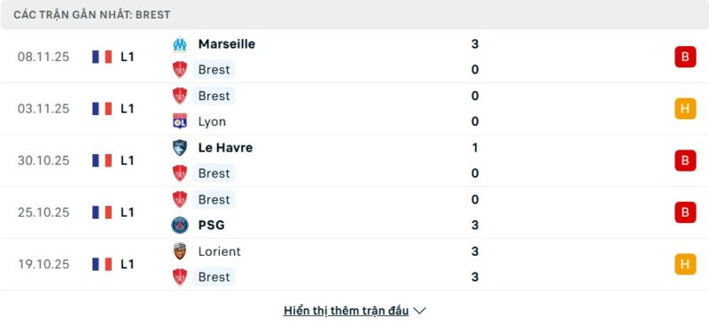 5 trận gần nhất của Brest: L-D-L-L-D
