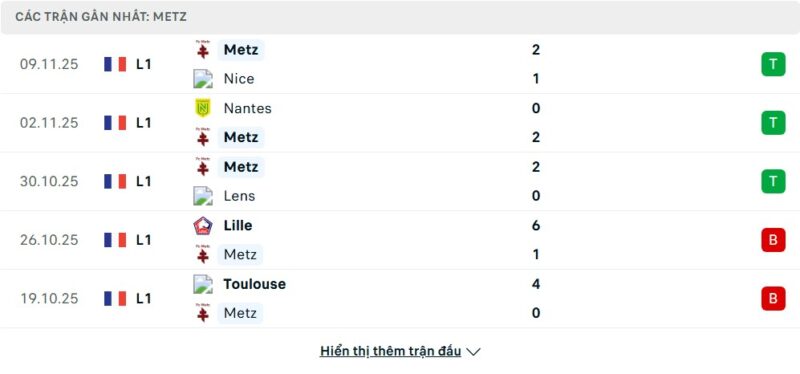 Bên kia chiến tuyến, Metz có dấu hiệu hồi sinh nhưng vị trí chưa thực sự an toàn. Với 11 điểm, họ xếp ngay trên Brest ở thứ hạng 14, biến trận này thành chung kết ngược. Metz vừa tạo bất ngờ khi thắng Nice và Lens, nhưng sự thiếu ổn định vẫn là vấn đề lớn của họ. Trước đó, đội khách từng nhận thất bại thảm hại với tỷ số rất đậm đà trước Lille hay Toulouse. Chuyến làm khách sắp tới dự báo nhiều rủi ro, khiến chuỗi trận thăng hoa ngắn ngủi của đội bóng này có nguy cơ bị chặn đứng bởi đối thủ đang rất khát điểm.