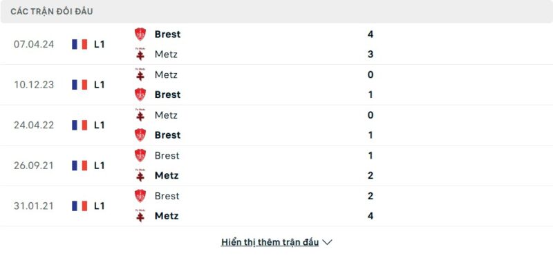 Thành tích đối đầu của Brest vs Metz