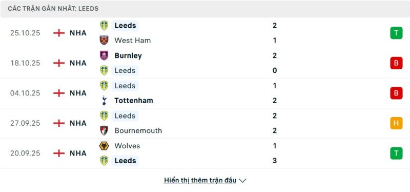 5 trận gần nhất của Leeds United: W-L-L-D-W