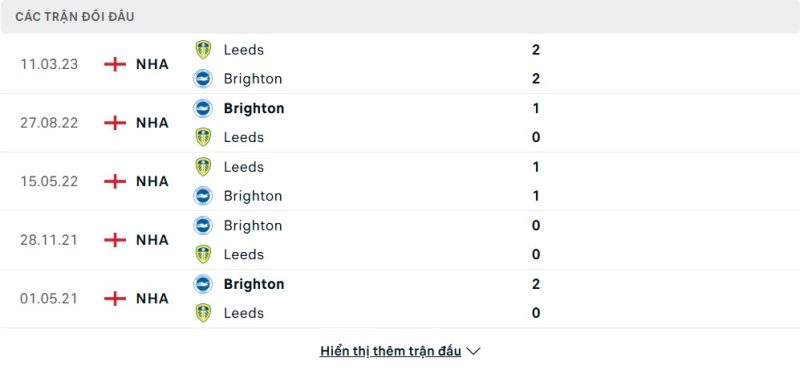 Thành tích đối đầu của Brighton & Hove Albion vs Leeds United
