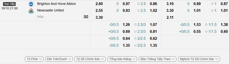 - Kèo tỷ số bóng đá hiệp 1: Brighton & Hove Albion 2-1 Newcastle United