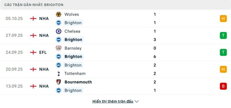 Brighton & Hove Albion đang thể hiện một phong độ cực kỳ ấn tượng trong giai đoạn đầu của mùa giải. “Những chú chim mòng biển” đang bay cao trên bảng xếp hạng nhờ một lối chơi tấn công đầy cống hiến và hiệu quả. Chuỗi trận gần đây của họ chứng kiến những kết quả vô cùng thuyết phục, đáng chú ý nhất là chiến thắng 3-1 trước Chelsea và việc đánh bại cả Manchester City với tỷ số 2-1. Xen kẽ đó là những chiến thắng hủy diệt ở đấu trường cúp. Với lợi thế sân nhà Amex và sự tự tin đang lên cao, Brighton sẵn sàng nghênh đón mọi thử thách.
