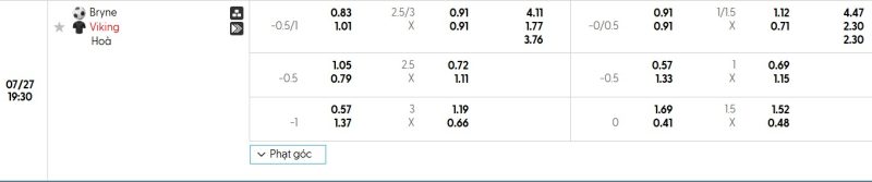Bảng Tỷ lệ kèo bóng đá Bryne vs Viking
