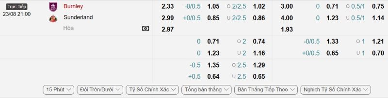 Bảng Tỷ lệ kèo bóng đá Burnley vs Sunderland