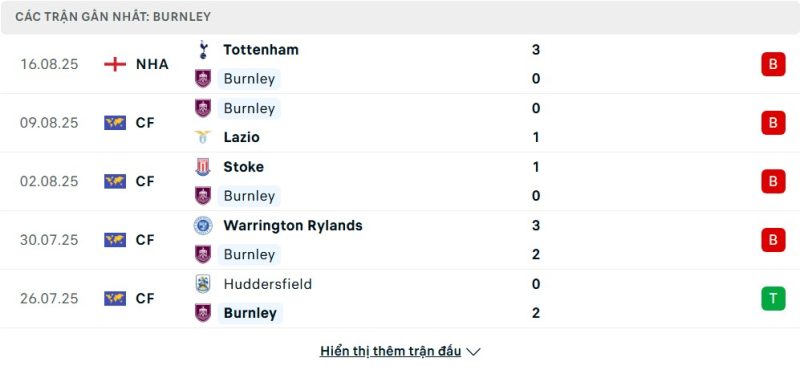 5 trận gần nhất của Burnley: L-L-L-L-W