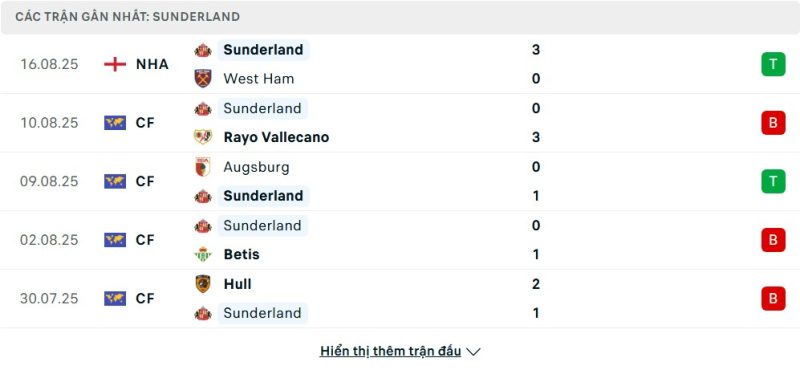 5 trận gần nhất của Sunderland: W-L-W-L-L