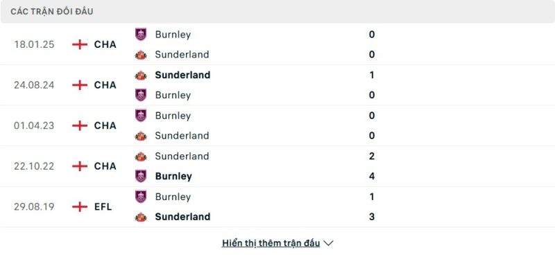 Thống kê phong độ gần đây Burnley vs Sunderland