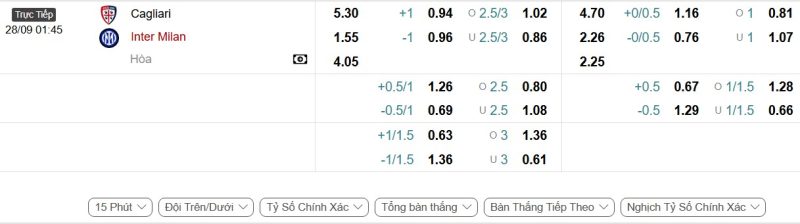 Bảng Tỷ lệ kèo bóng đá Cagliari vs Inter Milan
