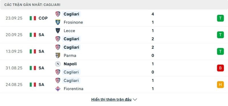 Cagliari đang có khởi đầu mùa giải Serie A khá ấn tượng với vị trí thứ 7 trên bảng xếp hạng sau 4 vòng đấu. Họ giành được 2 chiến thắng, 1 trận hòa và chỉ để thua duy nhất trước Napoli, đội đang đứng đầu bảng. Đáng chú ý, Cagliari vừa đánh bại Parma 2-0 và ngược dòng thắng Lecce ngay trên sân khách, cho thấy tinh thần chiến đấu bền bỉ. Ở Coppa Italia, họ cũng có chiến thắng đậm 4-1 trước Frosinone, khẳng định khả năng tấn công hiệu quả. Với những kết quả này, Cagliari đang trở thành một trong những đội bóng gây bất ngờ tại giai đoạn đầu mùa.