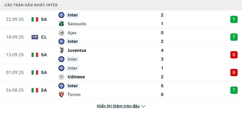 5 trận gần nhất của Inter Milan: W-W-L-L-W