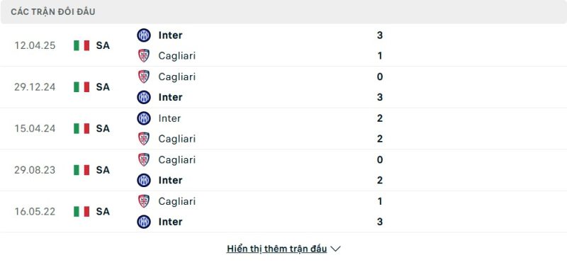 Thành tích đối đầu của Cagliari vs Inter Milan