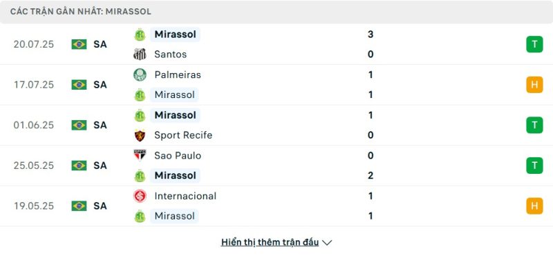 5 trận gần nhất của Mirassol: W-D-W-W-D