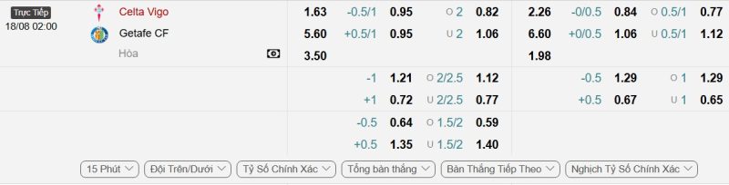 Bảng Tỷ lệ kèo bóng đá Celta Vigo vs Getafe
