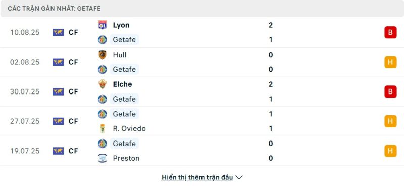 5 trận gần nhất của Getafe: L-D-L-D-D