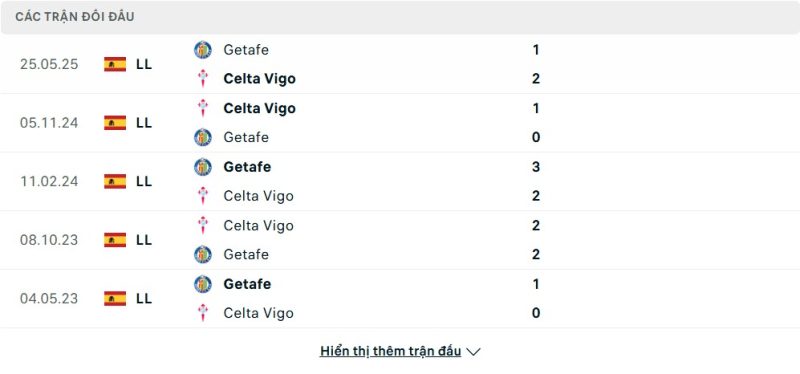 Thành tích đối đầu của Celta Vigo vs Getafe
