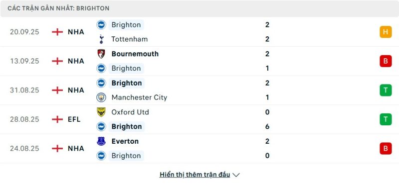 5 trận gần nhất của Brighton & Hove Albion: D-L-W-W-L
