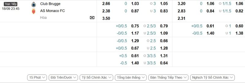 - Kèo tỷ số bóng đá hiệp 1: Club Brugge 0-1 Monaco