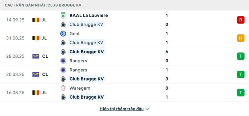 5 trận gần nhất của Club Brugge: L-D-W-W-W