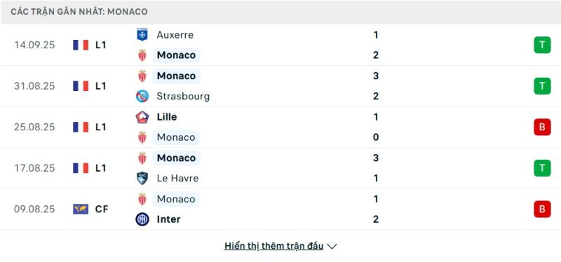 5 trận gần nhất của Monaco: W-W-L-W-L