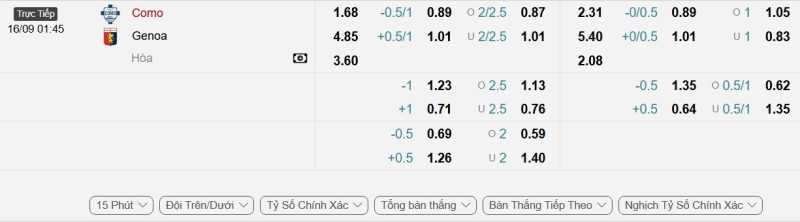 Bảng Tỷ lệ kèo bóng đá Como vs Genoa