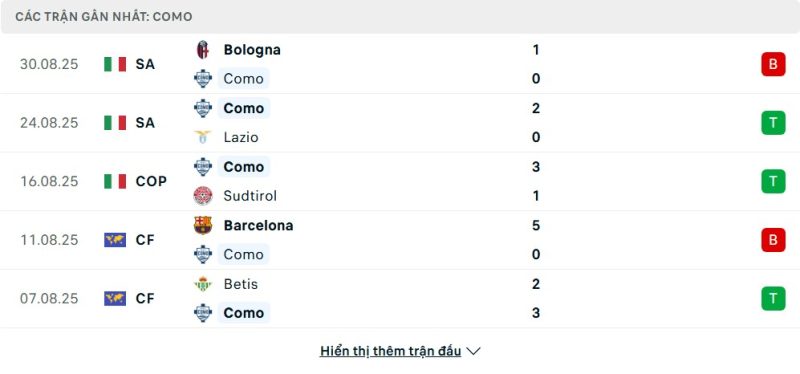 Como bước vào mùa giải Serie A 2025/26 với sự khởi đầu không tồi, giành được 1 chiến thắng và 1 thất bại sau hai vòng đấu. Chiến thắng ấn tượng trước Lazio 2-0 cho thấy khả năng thi đấu hiệu quả của đội bóng này trên sân nhà. Thất bại sát nút trước Bologna phần nào phản ánh sự thiếu ổn định, song Como vẫn đứng trong top 10 với vị trí thứ 9. Trước đó, Como cũng đã vượt qua Südtirol ở Coppa Italia, đồng thời thắng nhiều trận giao hữu trước Ajax, Lille và Al-Ahli, qua đó thể hiện sự tiến bộ rõ nét trong giai đoạn chuẩn bị mùa giải.