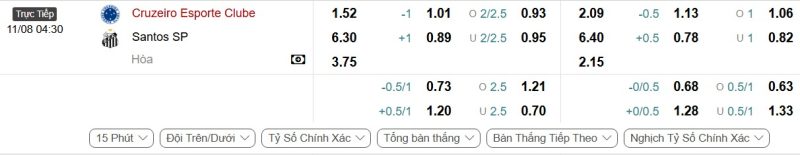 Bảng Tỷ lệ kèo bóng đá Cruzeiro vs Santos