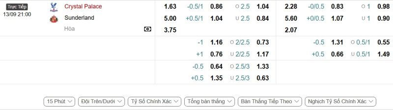 Bảng Tỷ lệ kèo bóng đá Crystal Palace vs Sunderland
