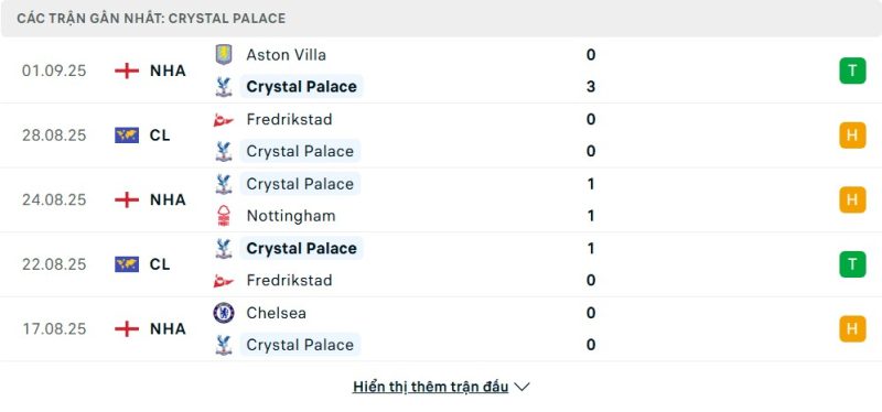 5 trận gần nhất của Crystal Palace: W-D-D-W-D