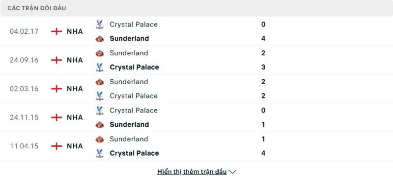 Thành tích đối đầu của Crystal Palace vs Sunderland