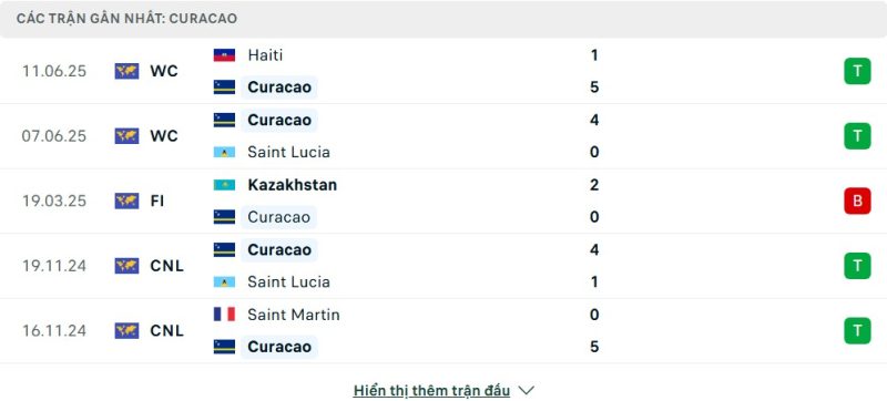 5 trận gần nhất của Curaçao: W-W-L-W-W