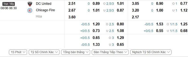 Bảng Tỷ lệ kèo bóng đá DC United vs Chicago Fire