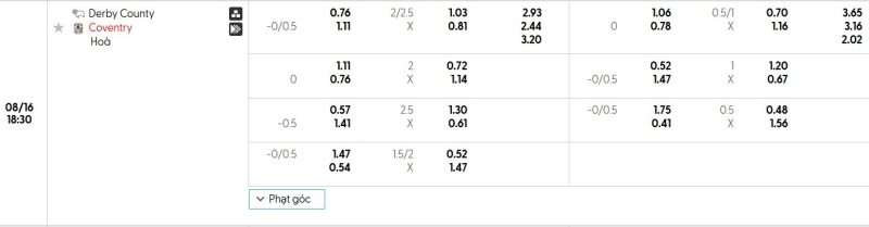 Bảng Tỷ lệ kèo bóng đá Derby County vs Coventry City