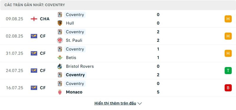 Bên kia chiến tuyến, Coventry City có giai đoạn chuẩn bị mùa giải khá thất thường. Họ thua đậm AS Monaco 0-5 nhưng cũng kịp thắng Bristol Rovers 2-0. Những trận hòa liên tiếp trước Real Betis 1-1, St. Pauli 2-2 và Hull 0-0 cho thấy hàng thủ đã cải thiện phần nào, song hàng công vẫn chưa tạo được sự bùng nổ. Phong độ này khiến Coventry bước vào chuyến làm khách trước Derby với nhiều dấu hỏi về khả năng ghi bàn.