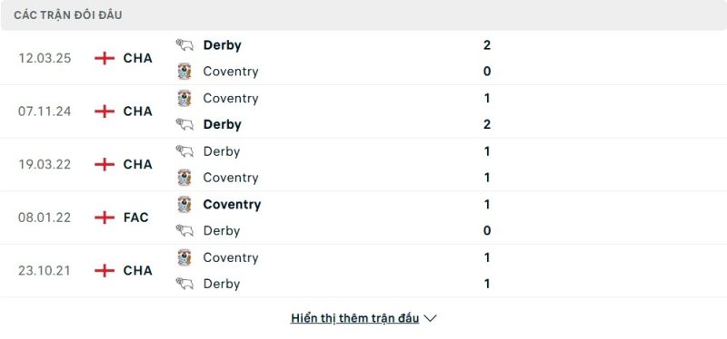 Thành tích đối đầu của Derby County vs Coventry City