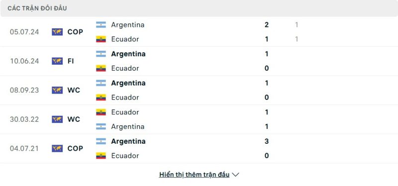 Thành tích đối đầu của Ecuador vs Argentina