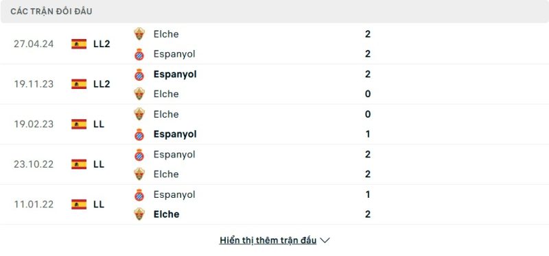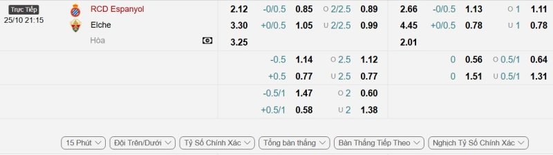 Bảng Tỷ lệ kèo bóng đá Espanyol vs Elche