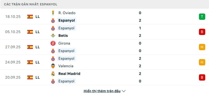 5 trận gần nhất của Espanyol: W-L-D-D-L