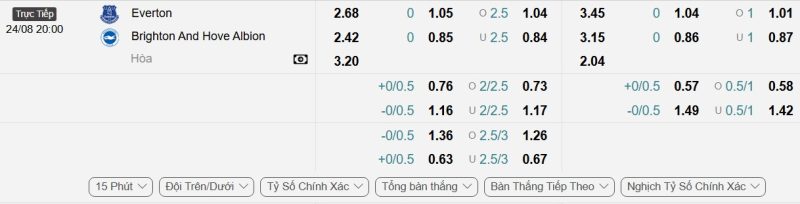 - Kèo tỷ số bóng đá hiệp 1: Everton 0-2 Brighton & Hove Albion